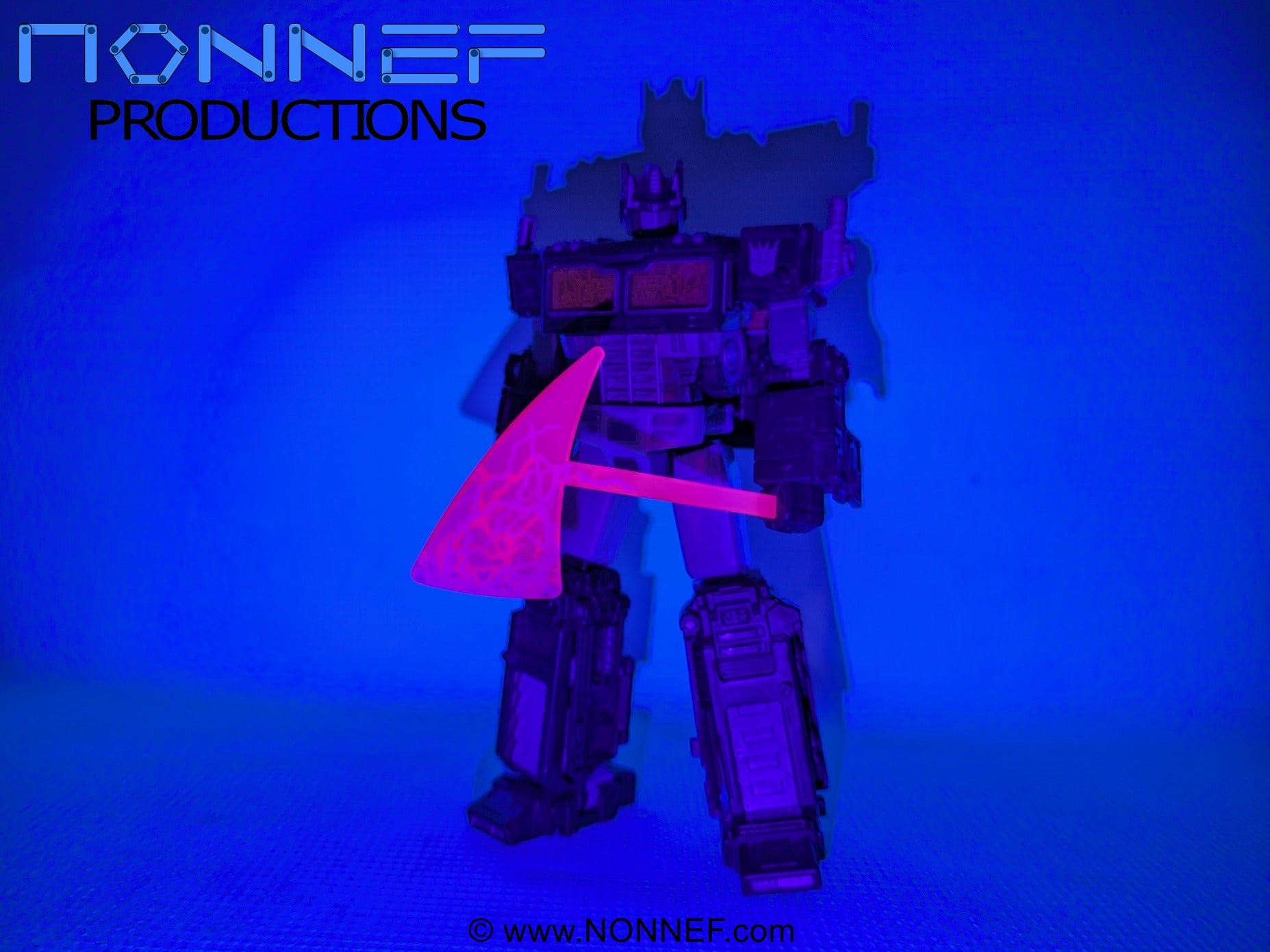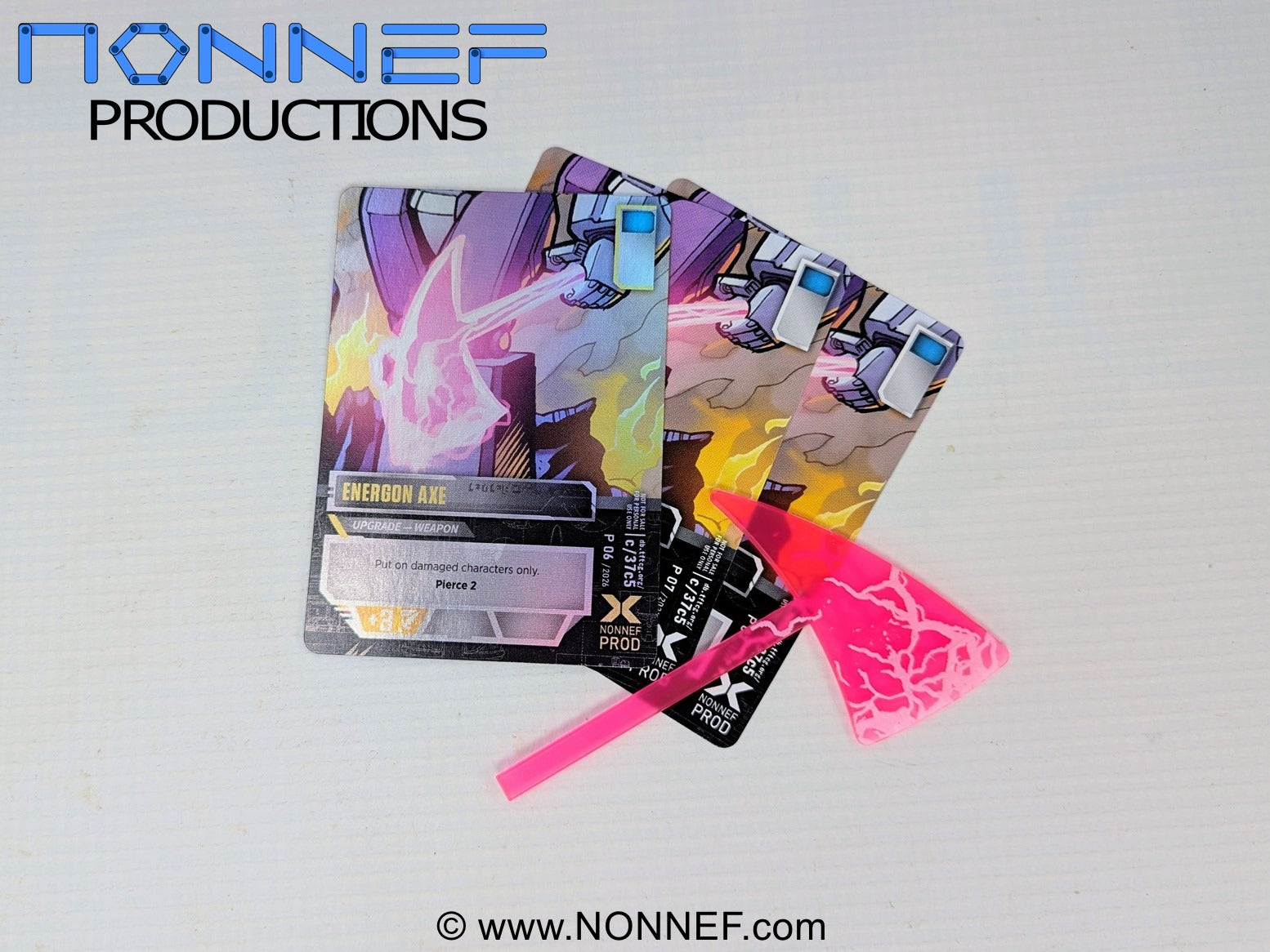 Physical version of the 'Energon Axe' playable card. Axe has a 5mm handle and glows under UV light.